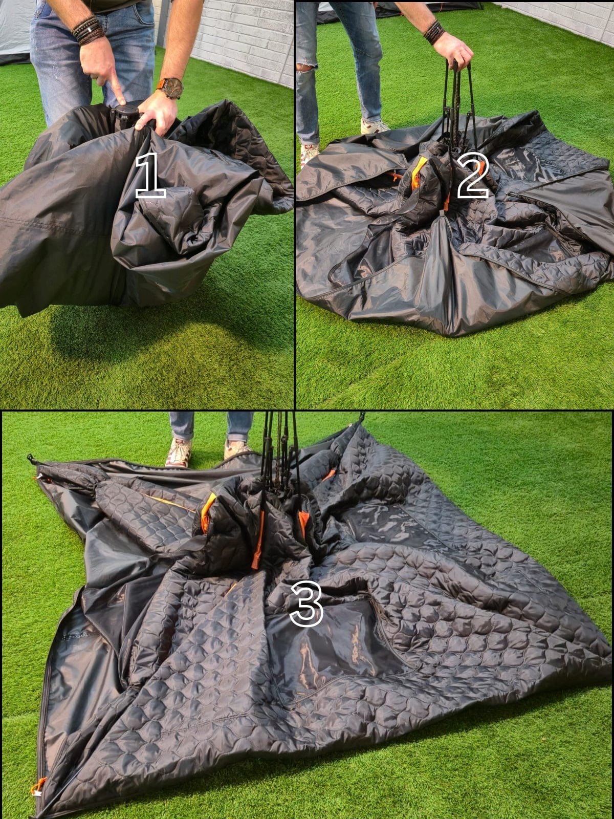 2. Face the chosen door’s arrow towards your chest and walk into the tent with the Culla. Place the wrapped Culla upright in the center of the tent with the hub facing the ceiling. Remove the compression straps while holding the hub in one hand, letting the legs fall outward.