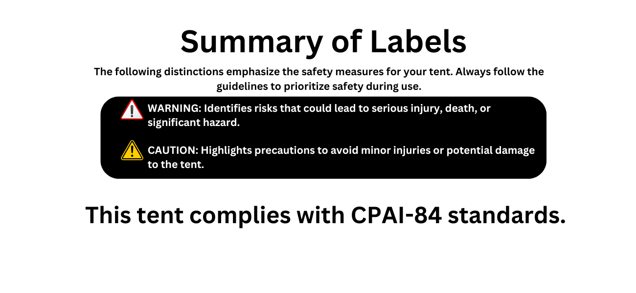 - Fire Hazard: The tent is not fireproof. Keep open flames, stoves, and heat sources away.