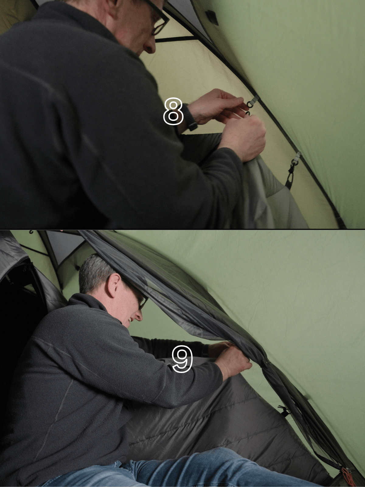 9. Hook each clip starting with the bottom clips at the back of the tent and work your way to the top for ease. Hook the final clip at the top of the insulation to the roof of the tent.